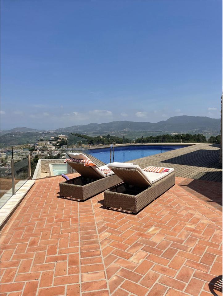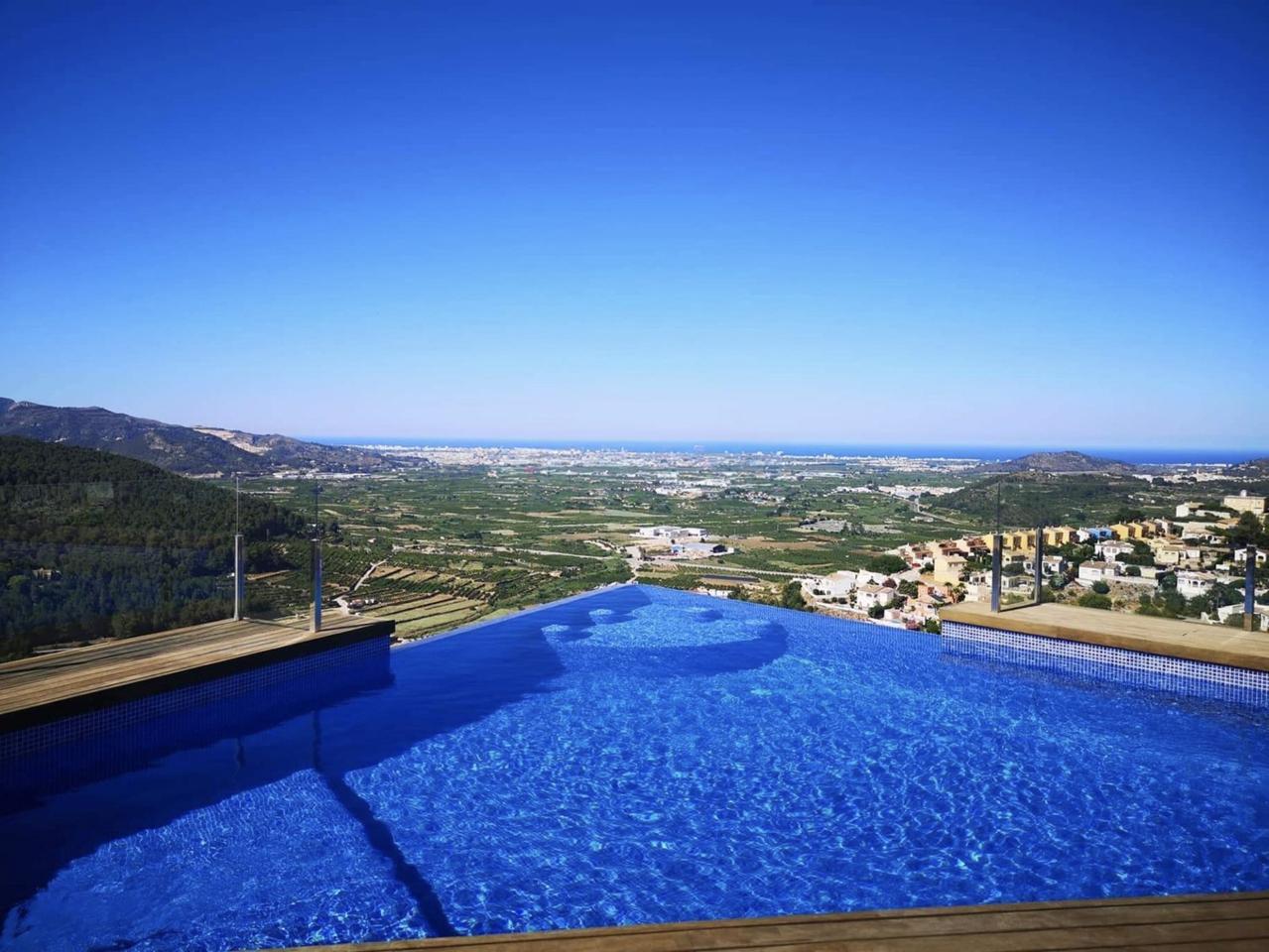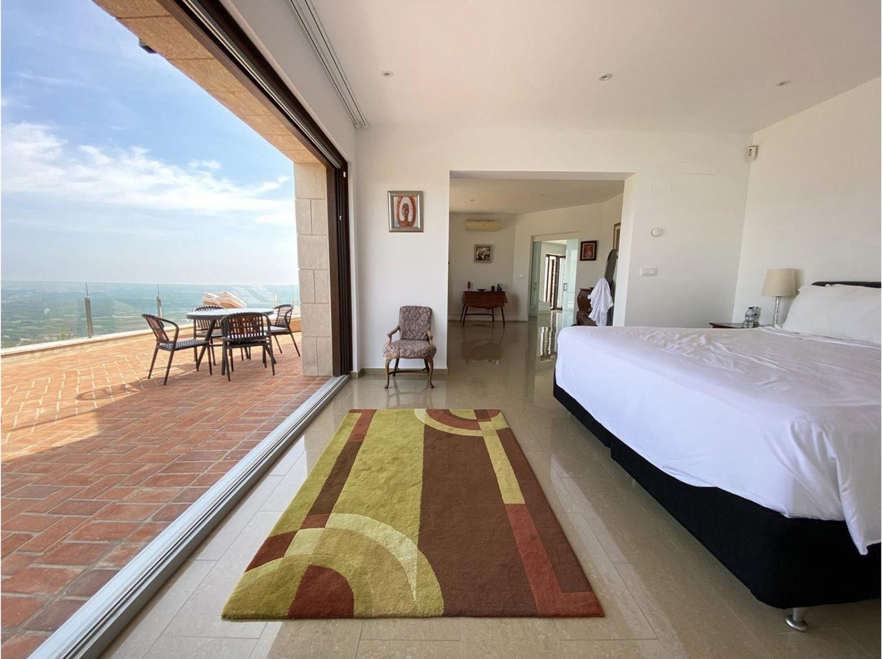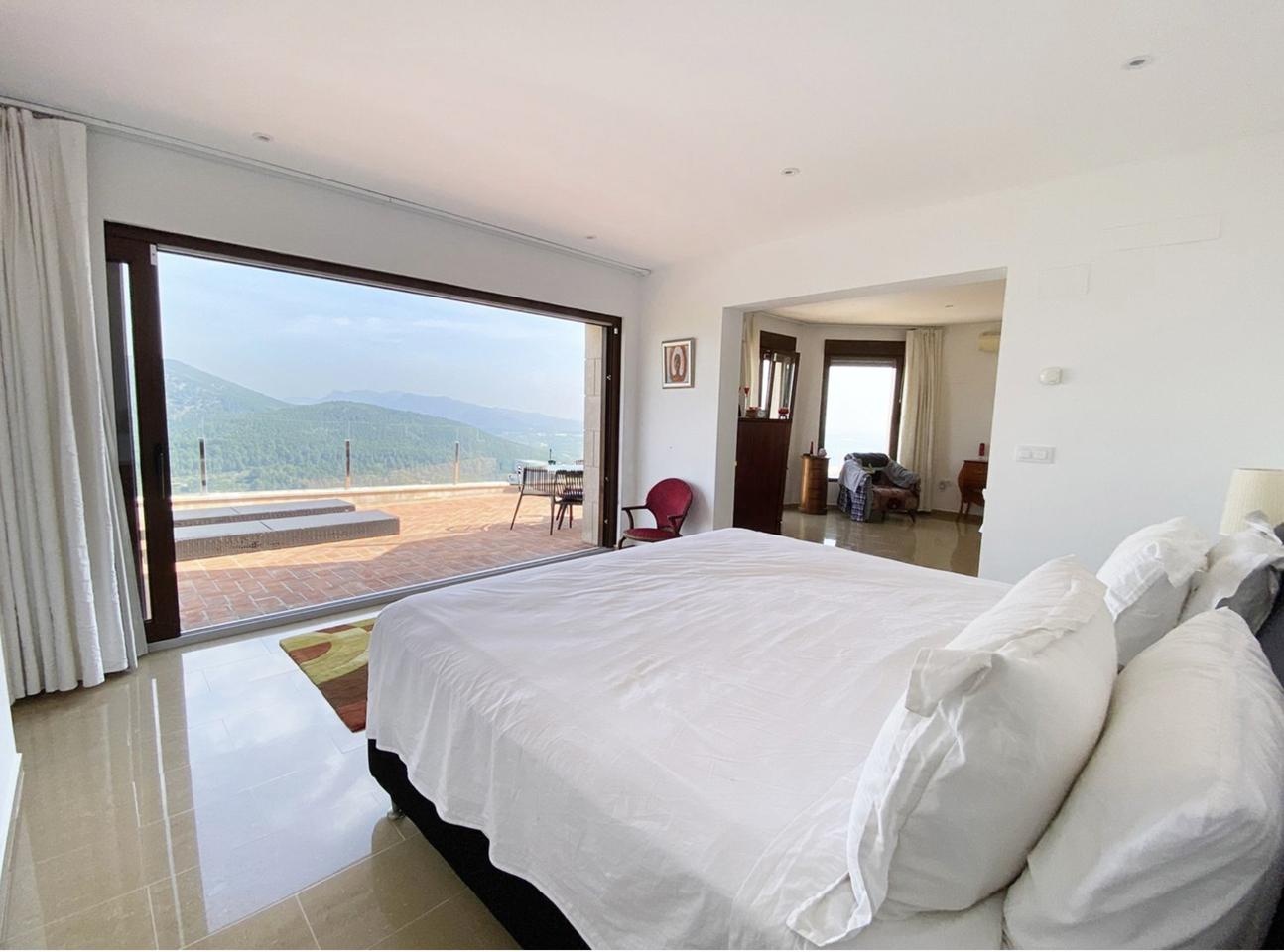 This luxurious villa in Ador, Safor Valencia, is perched on a hill, offering stunning panoramic views of the sea from its beautiful infinity pool. The interior boasts a modern and sleek design, featuring a double-height feature staircase. The main living space and master bedroom provide breathtaking views of the pool and the sea.