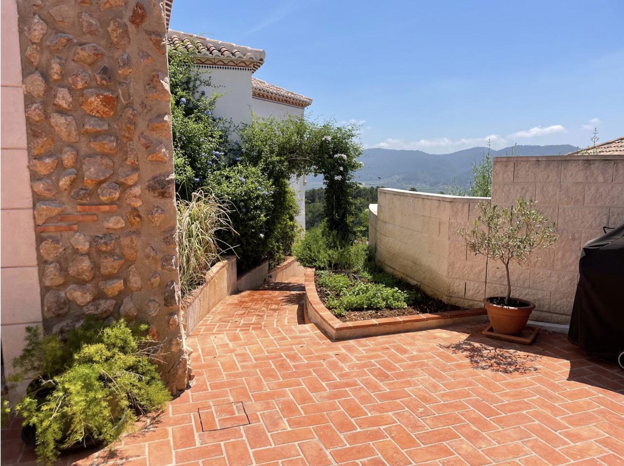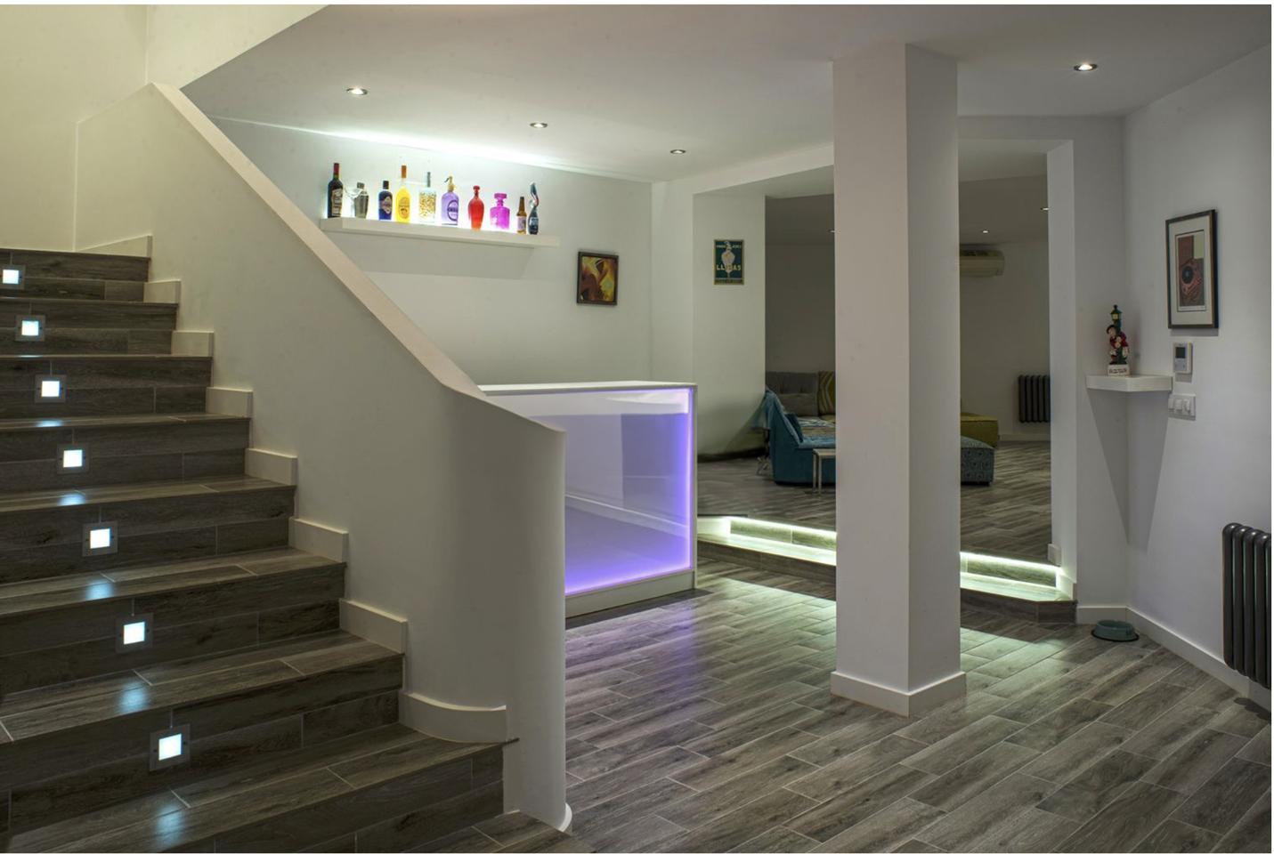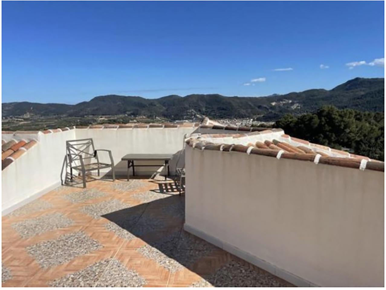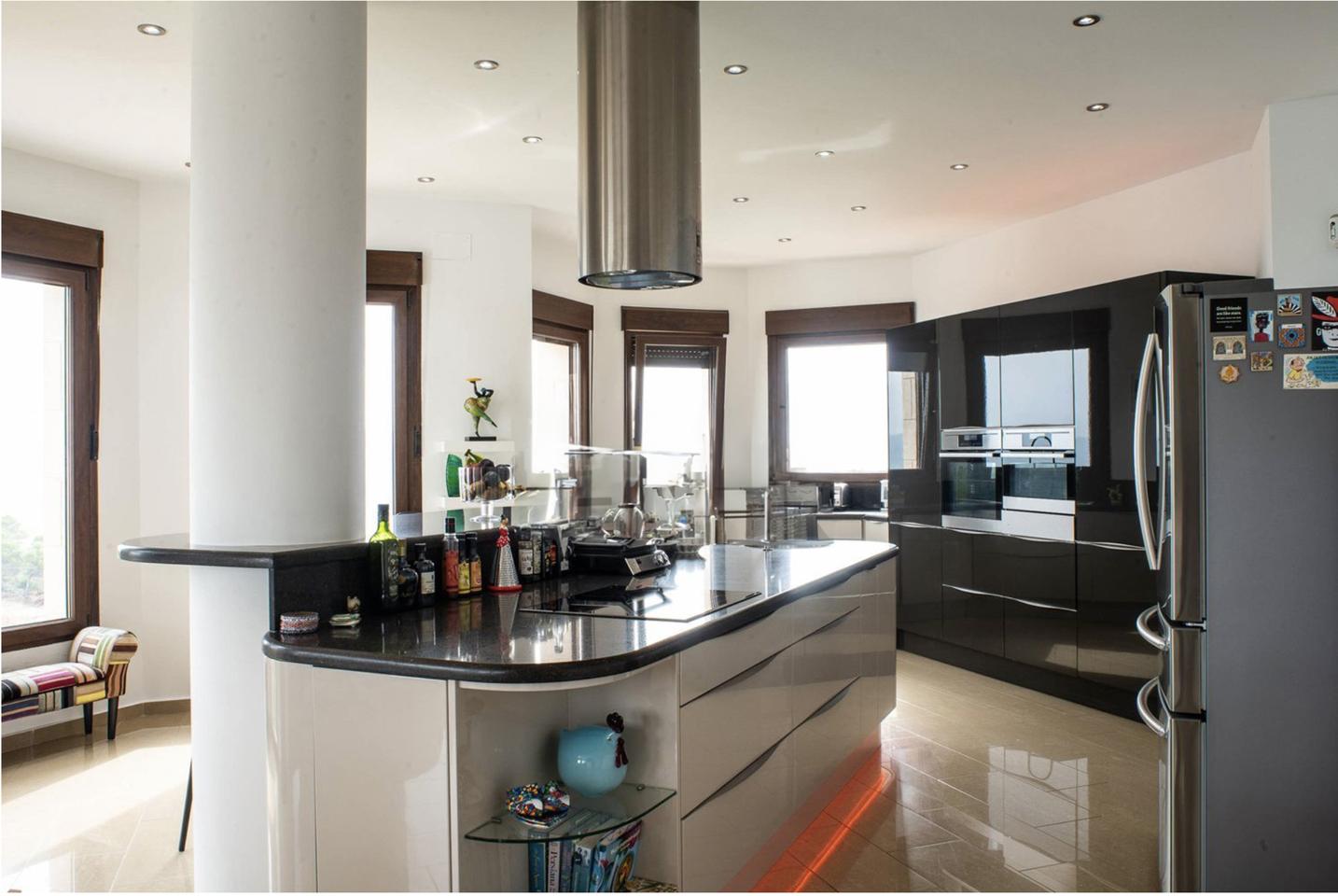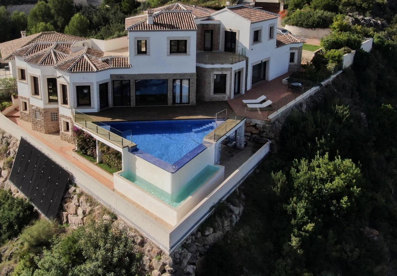 This luxurious villa in Ador, Safor Valencia, is perched on a hill, offering stunning panoramic views of the sea from its beautiful infinity pool. The interior boasts a modern and sleek design, featuring a double-height feature staircase. The main living space and master bedroom provide breathtaking views of the pool and the sea.