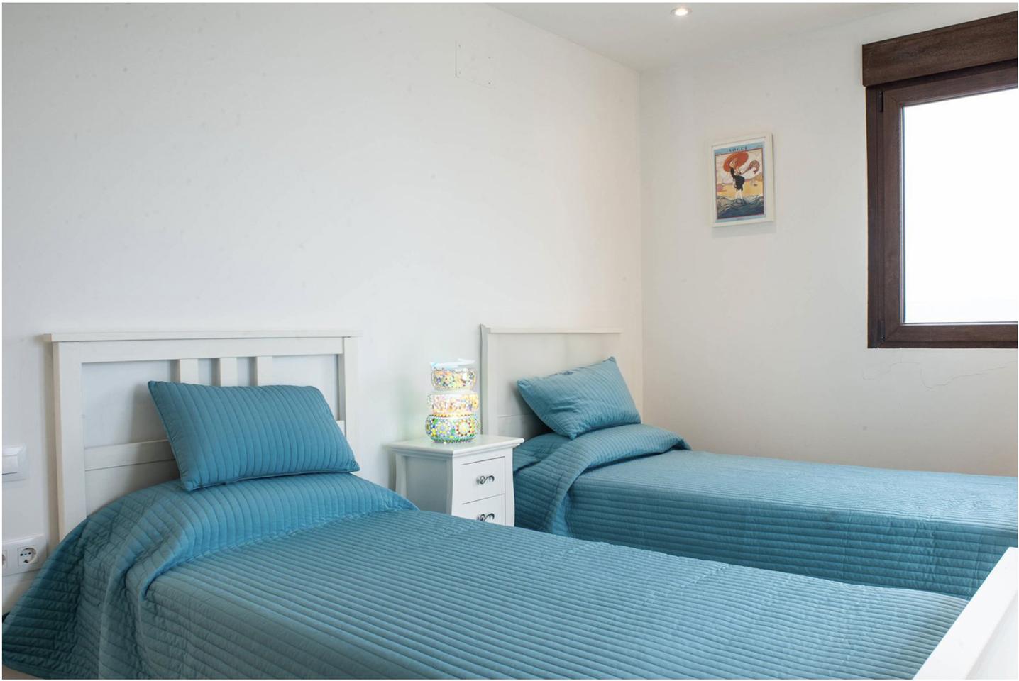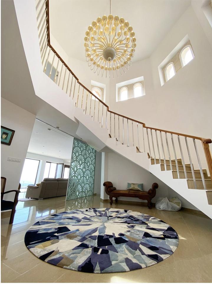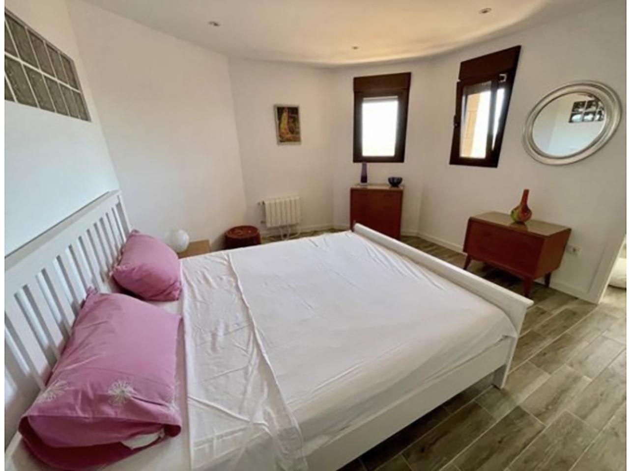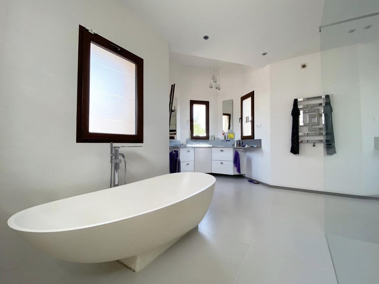 This luxurious villa in Ador, Safor Valencia, is perched on a hill, offering stunning panoramic views of the sea from its beautiful infinity pool. The interior boasts a modern and sleek design, featuring a double-height feature staircase. The main living space and master bedroom provide breathtaking views of the pool and the sea.