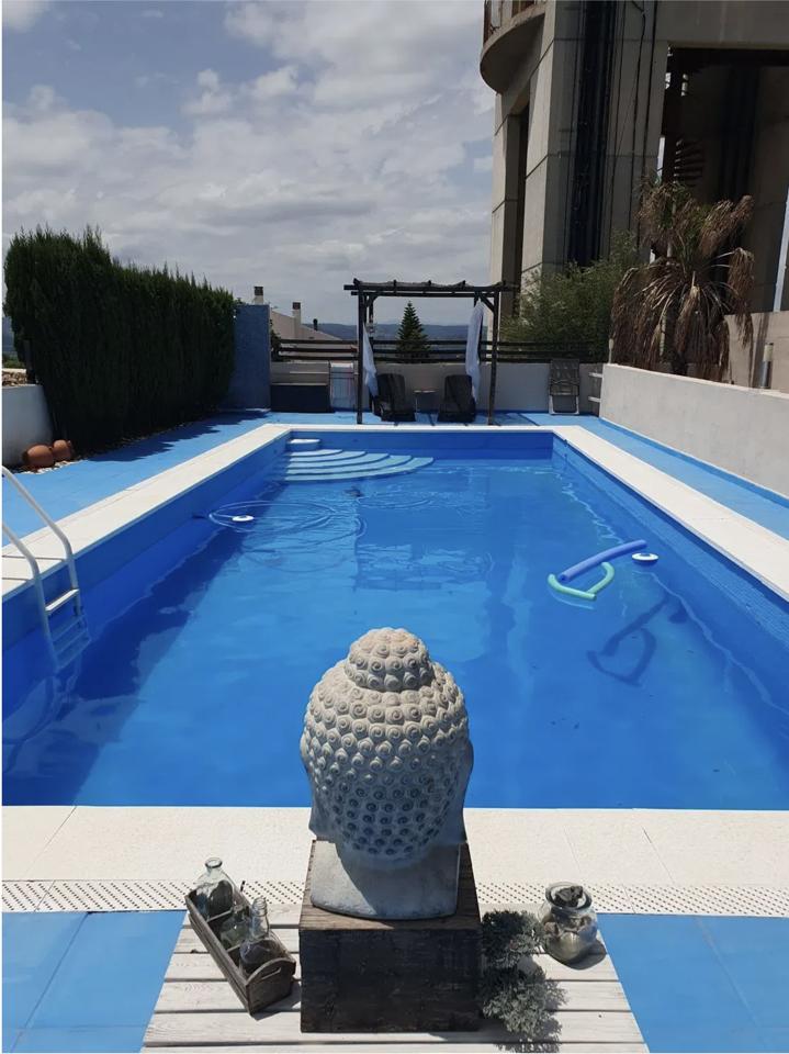 The house spans two floors and has a total built area of 300 m², with 200 m² dedicated to the living area. It features four bedrooms and three bathrooms, all set on a plot of 2,000 m². The villa also offers a terrace and a balcony, and parking space is included in the price. The existing construction is in good condition, with built-in wardrobes and plenty of storage. The property is east-facing and includes central heating with fuel oil, as well as air conditioning. A beautiful swimming pool completes the offering.
