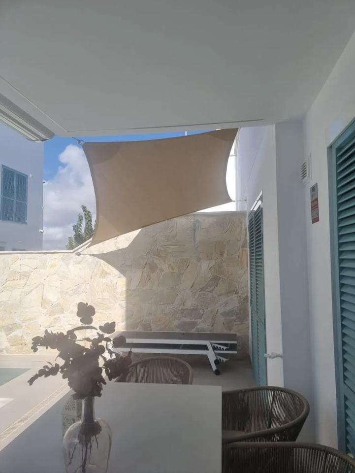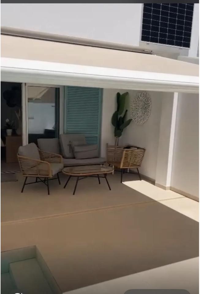 The property includes a 30-meter front patio with artificial turf and a spacious 70-meter rear patio featuring a private 6×3 meter saltwater pool. An extendable awning, also 6×3 meters, provides shade in the outdoor area, which is complemented by outdoor furniture. The house faces both north and south, ensuring natural light throughout the day.