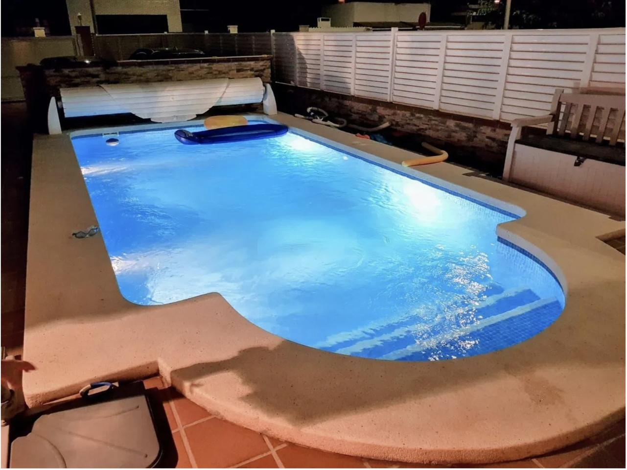 The outdoor space is equally impressive. A large open area accommodates up to two vehicles, while a beautiful private pool—lined with glass mosaic and equipped with a salt chlorination system and shutter-style cover—provides a luxurious touch. An outdoor shower completes the exterior amenities.