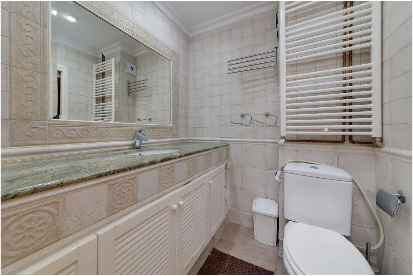 The apartment is being sold furnished and includes appliances, air conditioning in each bedroom, radiator heating, and a natural gas connection. Additional features include a wood-burning fireplace, a food elevator from the kitchen to the terrace, a gallery/pantry, and a laundry room. Built-in wardrobes offer ample storage throughout.