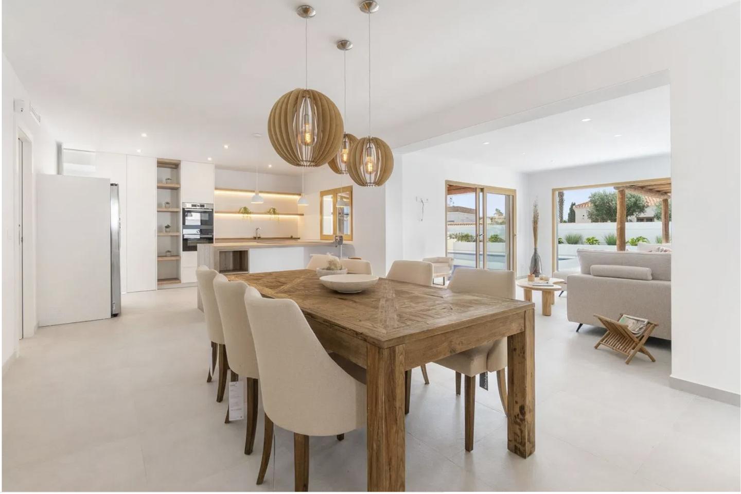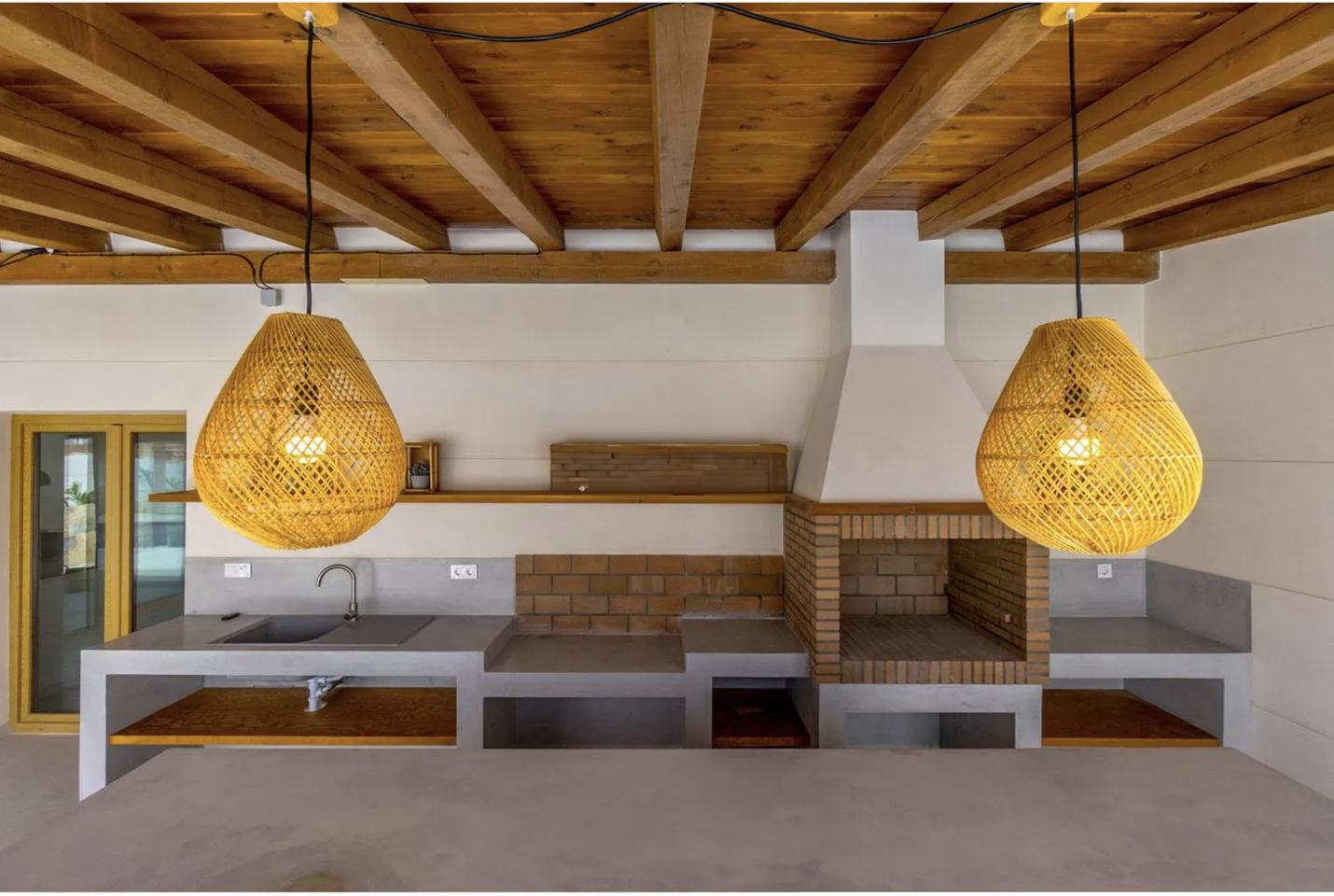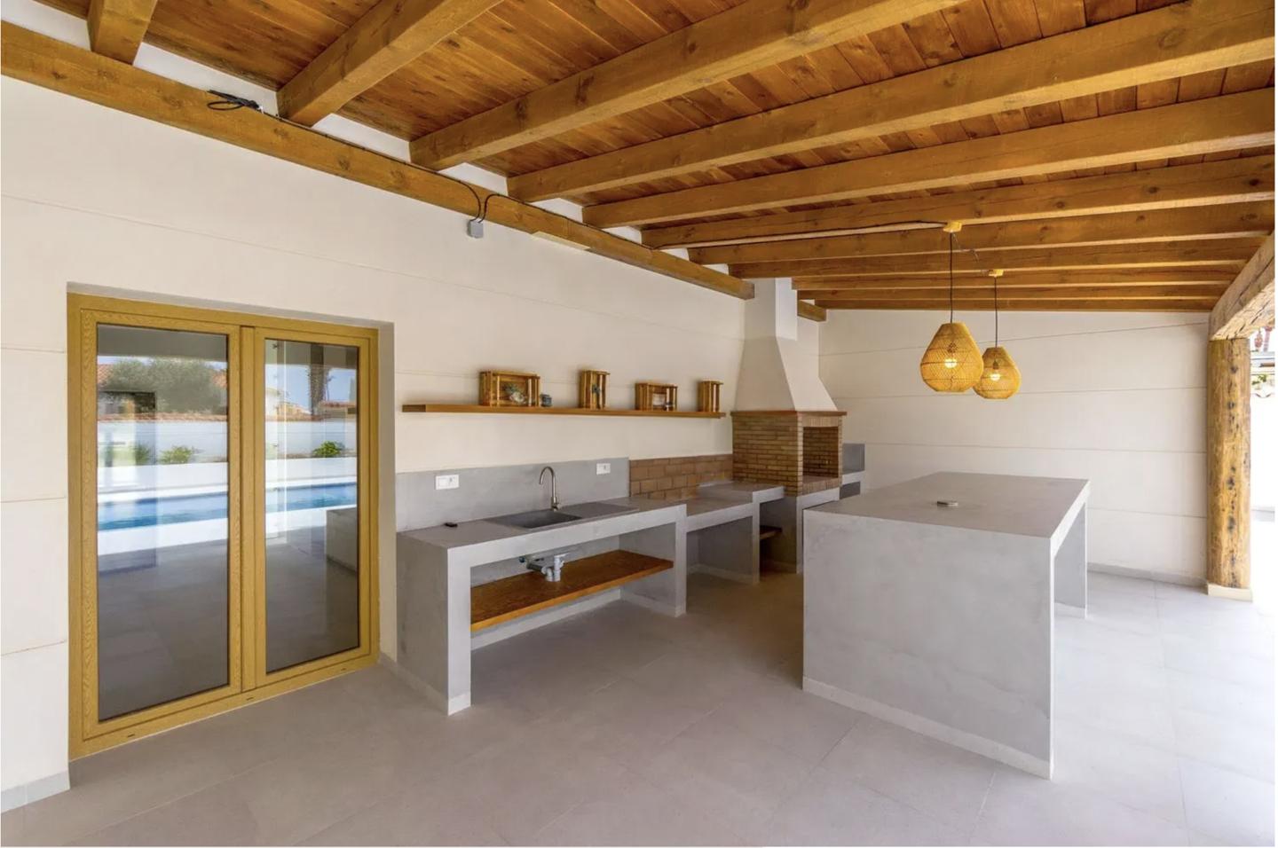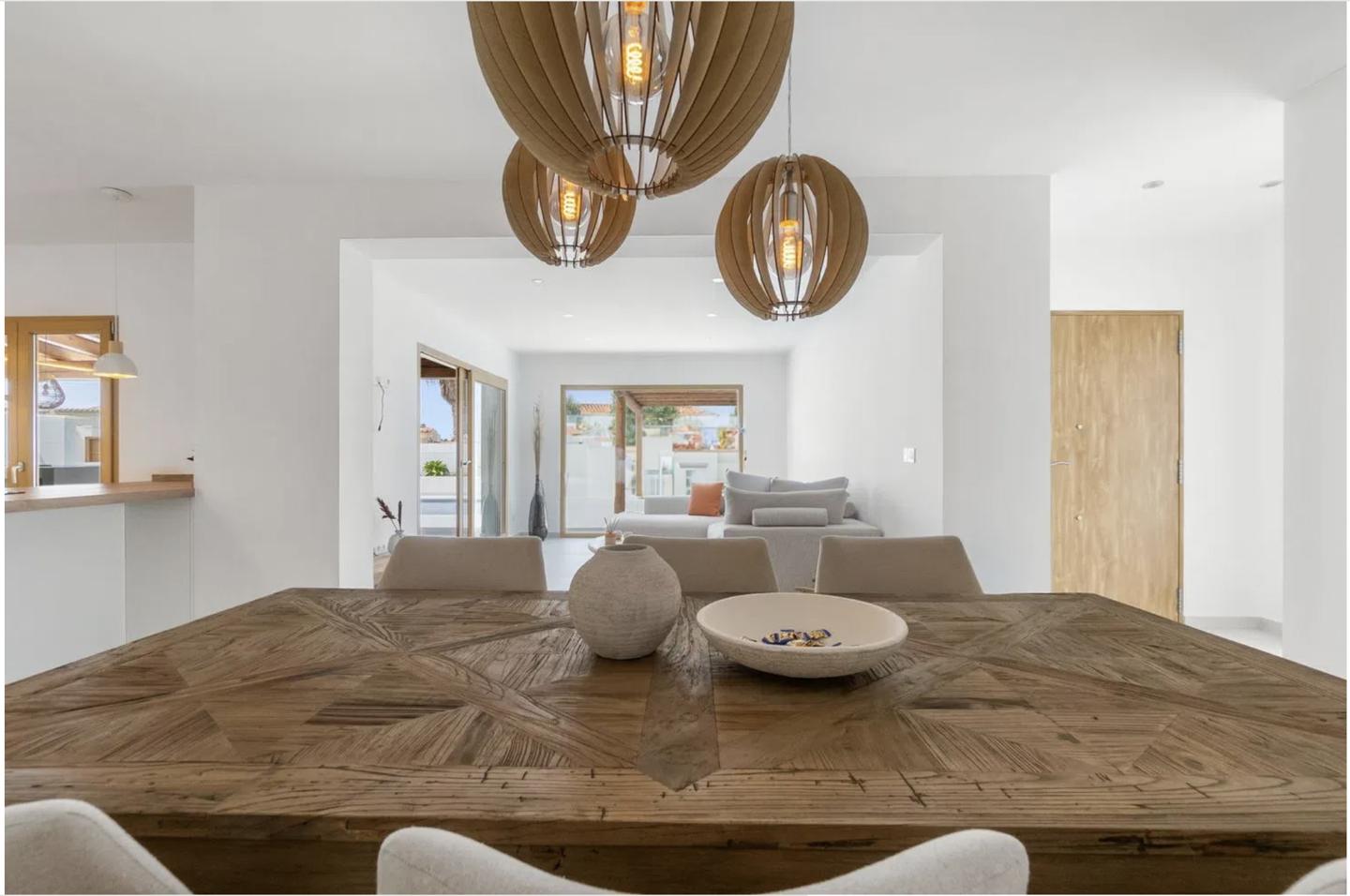 Inside, the villa features four spacious bedrooms and three elegant bathrooms, all designed with comfort and style in mind. The interior is warm and inviting, with brand-new furnishings included, and showcases a tasteful mix of rustic accents and contemporary finishes. Built-in wardrobes provide ample storage, while the overall layout ensures both functionality and flow.