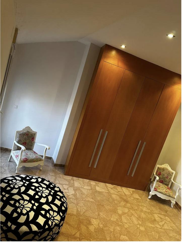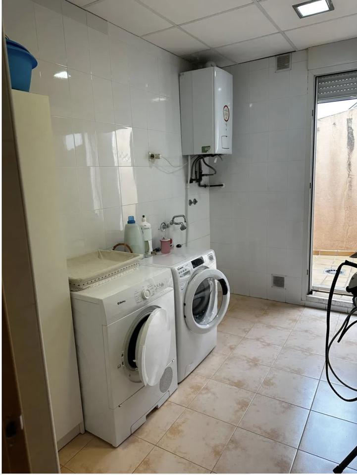 The upper level houses three additional bedrooms, each with built-in wardrobes and custom interior fittings, including drawers and trouser racks. A large corner terrace provides impressive views of both the city and the sea. This floor also includes a bathroom with a shower, a utility room, a drying terrace, and access to a large storage room.