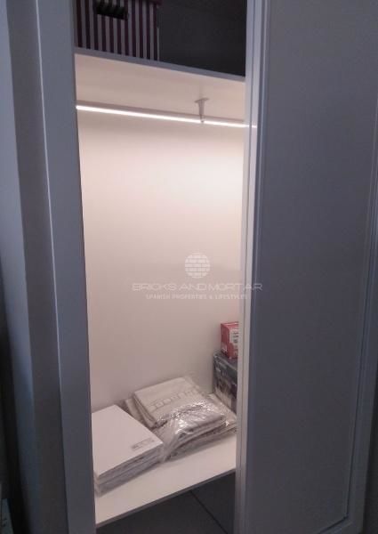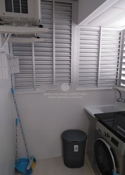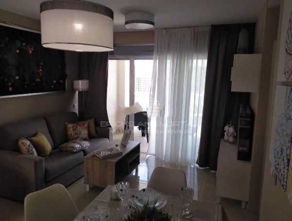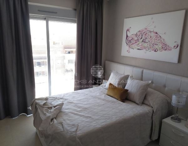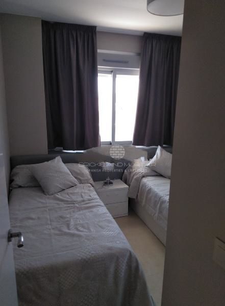 Apartment on the tenth floor. South orientation. With views of the sea without buildings that obstruct the vision. It has a spacious living room, a large master bedroom with access to the terrace and an en-suite bathroom with a hydromassage shower. Secondary room with two single beds. Both rooms have the beds with trundle and lined wardrobes and interior light. Second bathroom. The kitchen equipped with top brand appliances. The electric fire by glass ceramic. Outside laundry room with washer-dryer, electric water heater for hot water, clothesline and sink. All blinds are motorized.