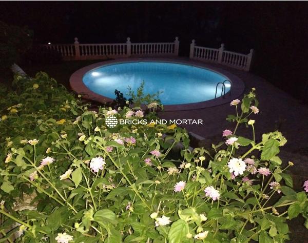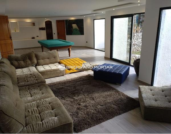 The outdoor space is truly delightful, offering two extensive gardens. One opens directly to the living room, while the other covers more than 400 square meters and features a round pool, ensuring privacy and delivering exceptional views.