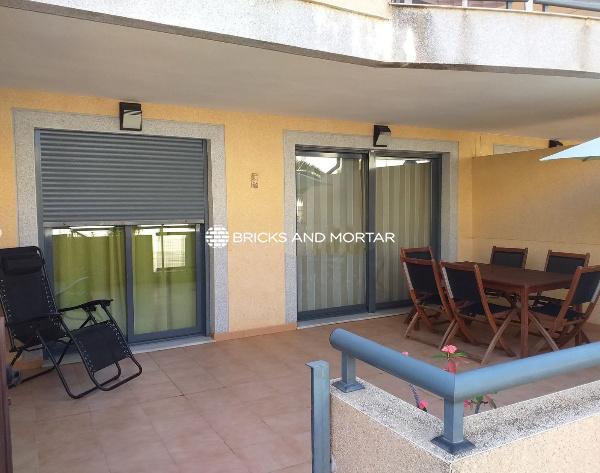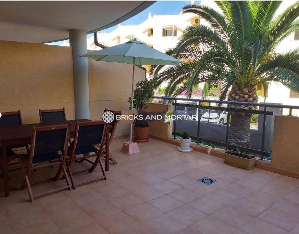 This nearly new ground floor apartment is situated just 100 meters from the beach, offering a comfortable and convenient living space. It comprises a spacious living room, a generous 25-square-meter terrace, two large bedrooms with the master bedroom having an en-suite bathroom, two bathrooms in total, an independent kitchen equipped with appliances, a laundry room, and a garage.