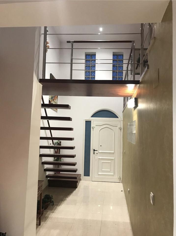 The ground floor features a well-appointed garage, entrance area, bathroom, living room, kitchen, music studio, and terrace. Moving upstairs to the first floor, you will find two spacious main bedrooms with built-in wardrobes, as well as another bathroom. The attic space is utilized as two guest rooms and a reading room, which can alternatively serve as a living room, office, or any other purpose as desired.