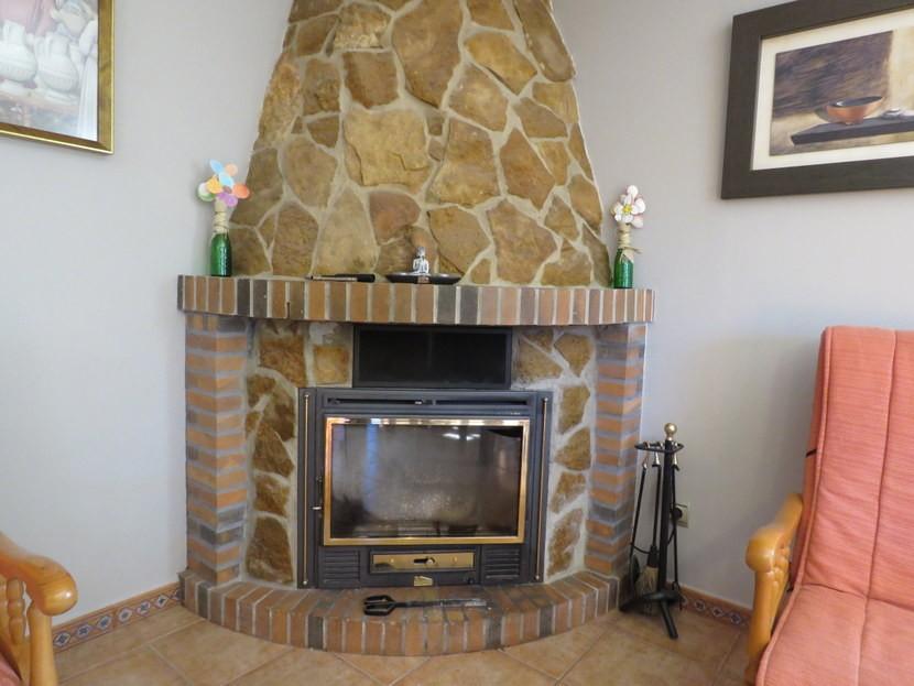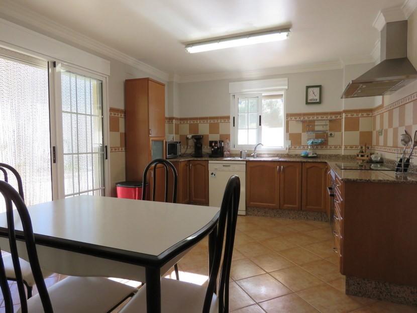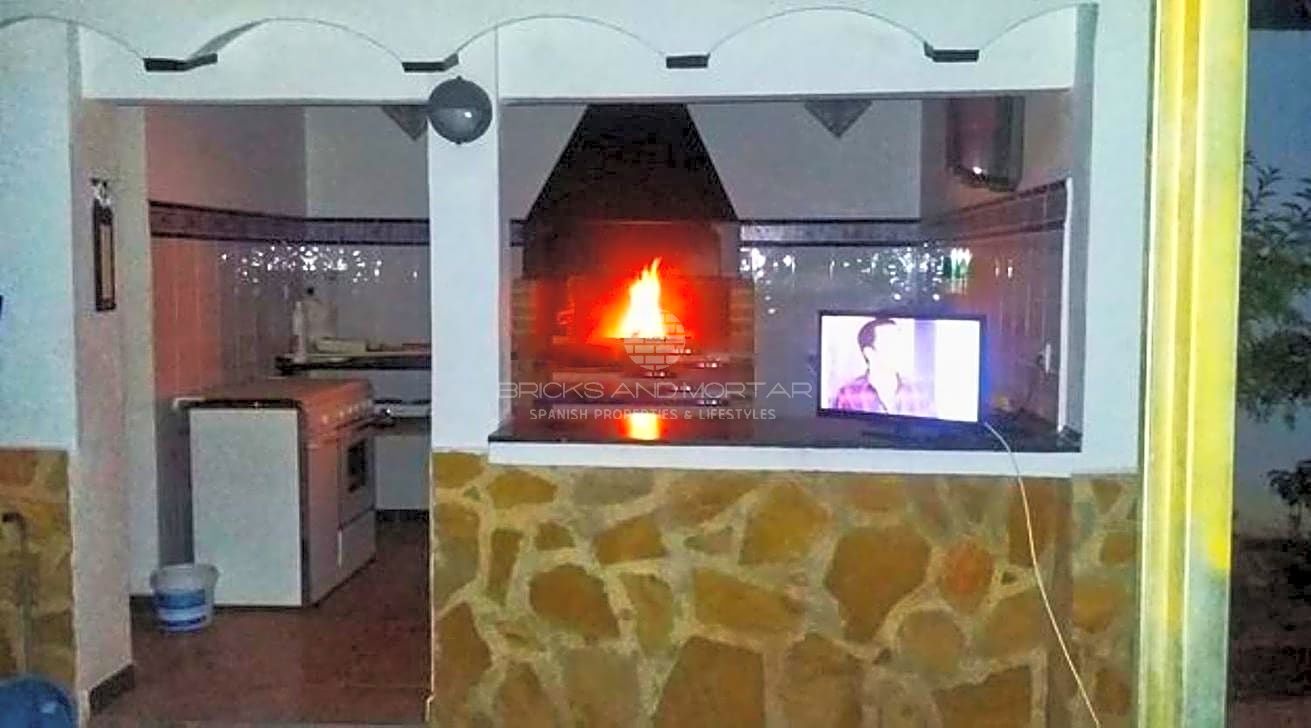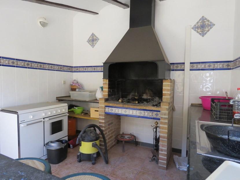 To the side of the pool there is an outdoor kitchen with paellero barbecue and outdoor dining area.