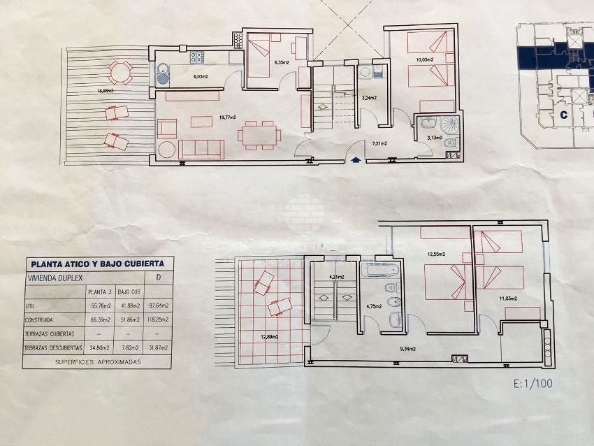 Duplex penthouse like new that has an elevator and garage included in the price. It also has air conditioning with heat pump in all rooms and electric heating radiators in the corridors. The house is distributed over two floors. On the ground floor it has 1 double bedroom, 1 single bedroom, 1 full bathroom, 1 living room, 1 pantry with sink, 1 kitchen and a 19m2 terrace. On the second floor it has 2 double bedrooms, 1 full bathroom and a 13 m2 terrace. Good construction qualities. Located 300m from the beach.