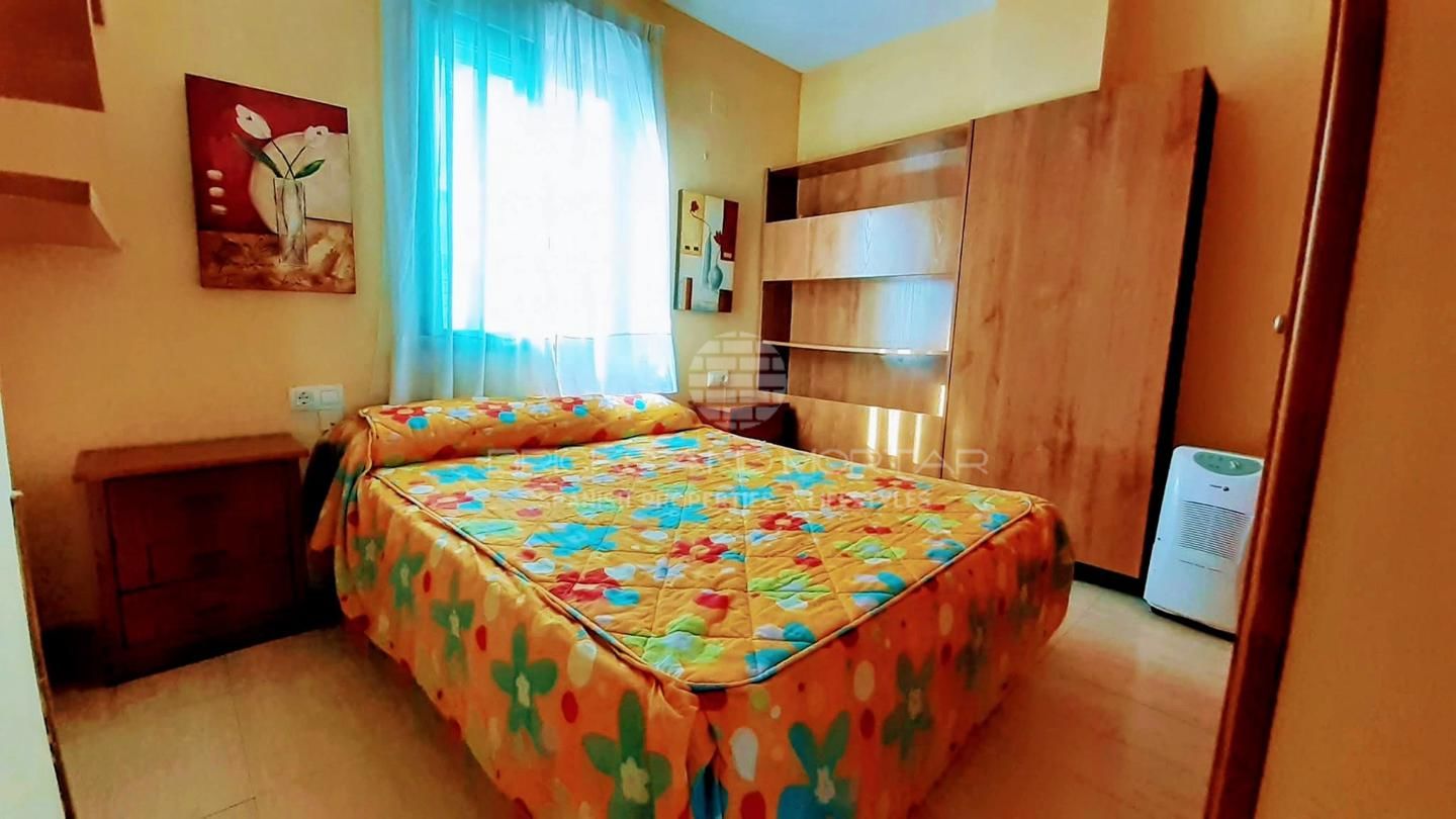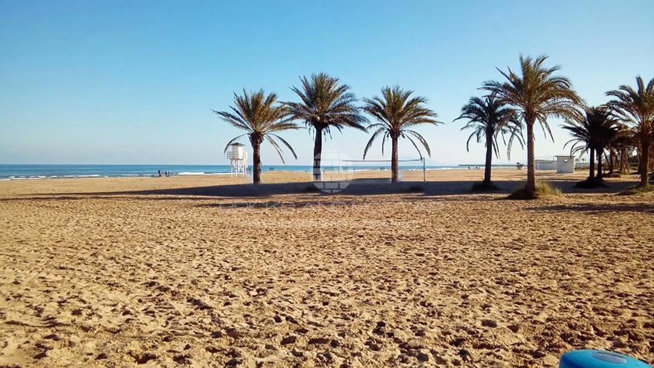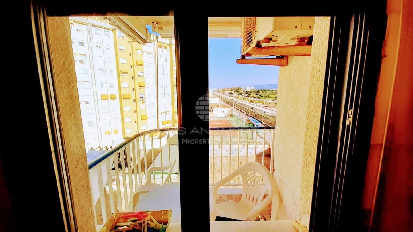 Gandía beach sun, sea and beach. Apartment on the 5th exterior floor, with elevator, rectangular in shape with windows and shutters, to the outside in all the openings. Two bedrooms with large built-in wardrobes with trunk and drawers, windows and shutters, with a / c living room, kitchen furnished and equipped with a ceramic hob, oven, high and low cabinets, terrace with awnings, twelve-part blue heat module heater.