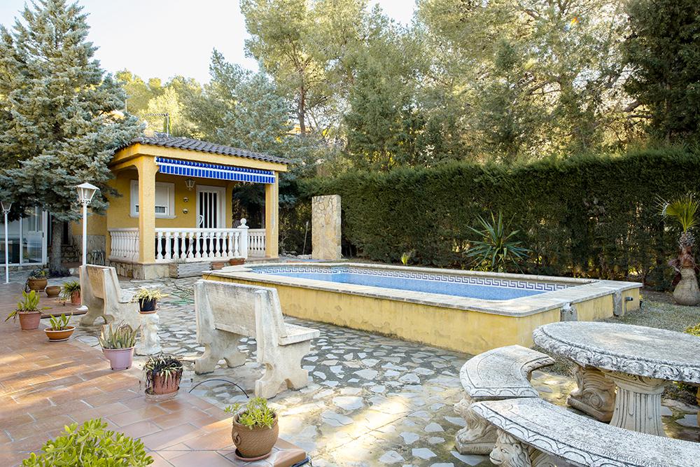 In addition to the main building, this property also has a large plot where we find the swimming pool, an ample garden, and an independent construction with kitchen, bathroom, and paella-barbecue area.